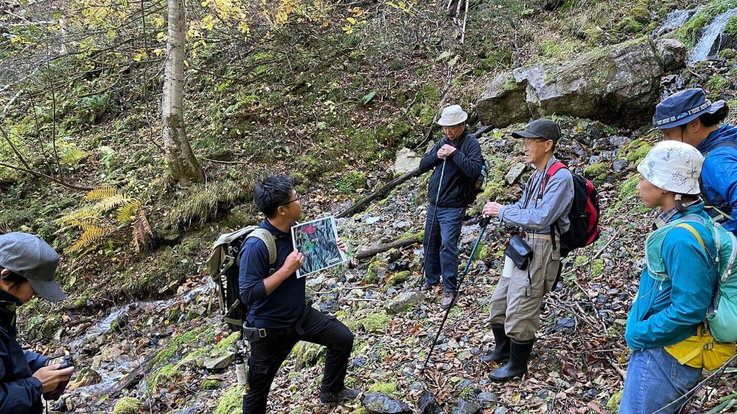 午後からは専門ガイドと共に日本最大規模の黒曜石産地「赤石山」へ、トレイルツアーです。自然観察をしながら山を登り、「八号沢露頭」を見学します。