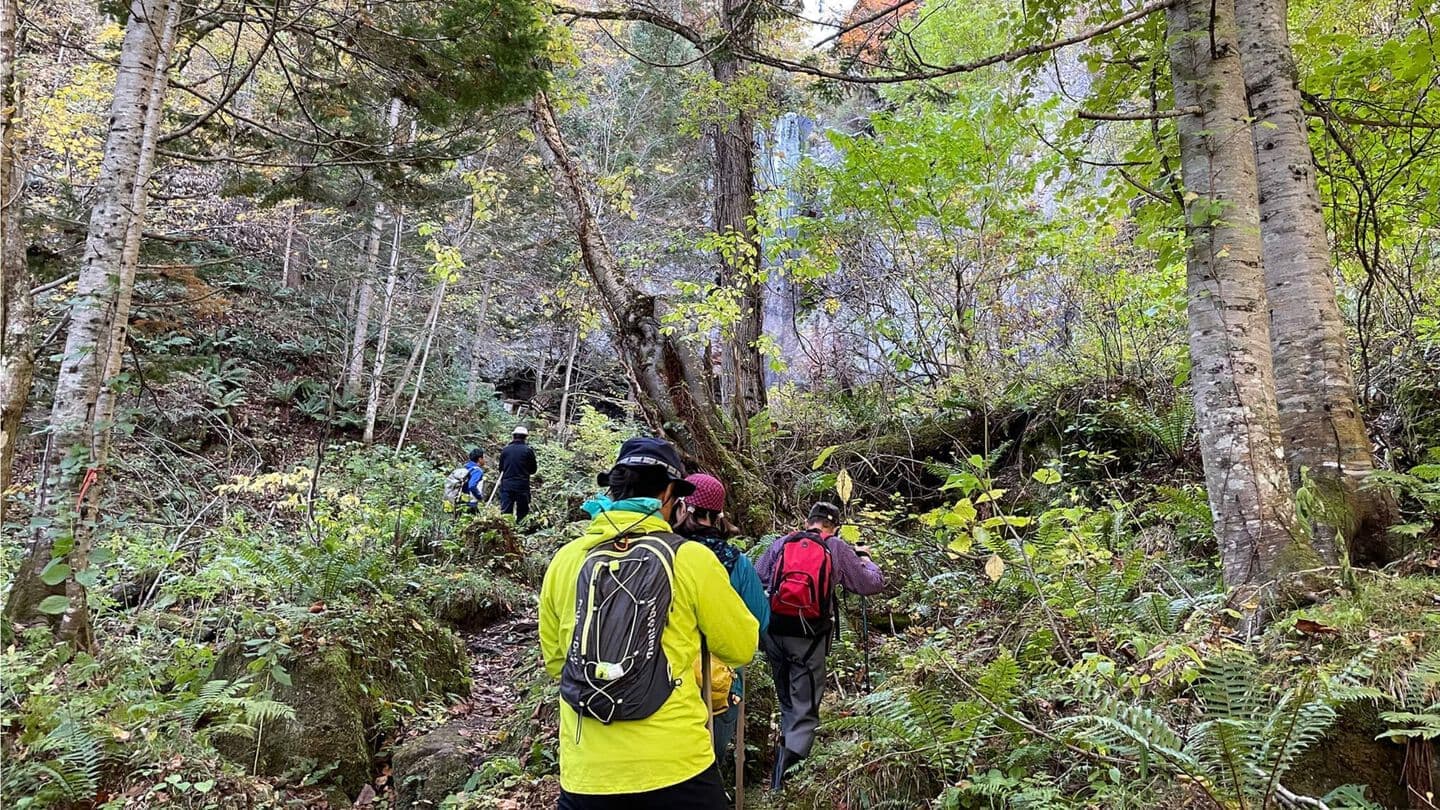 午前中は、現地専門ガイドによるトレッキングツアーです。林道を1列になって登り、黒曜石溶岩から噴き出す滝、深山渓谷の「あじさいの滝路頭」を目指します。